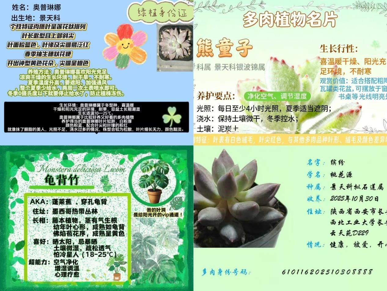 绿植领养环节人气火爆,百余名师生通过转发推文集赞的方式,成功领养了多肉盆栽。活动开展过程中,主办方收到了30余份参与者提交的绿植生长照片和设计新颖、内容详实“绿植身份证”,在标注了植物的生长习性、养护要点的同时,还融入了环保理念。领养活动让师生在照料绿植的过程中,培养了责任意识,将绿色生活理念转化为实际行动。